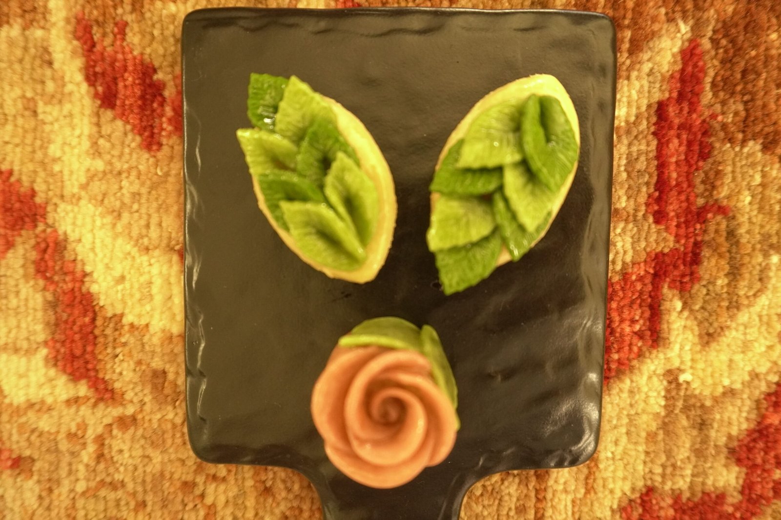 Marzipan flowers, pumpkins, and other shapes bundled together. They come in blue, red, purple, and other colors. They are ideal as gifts and public events.